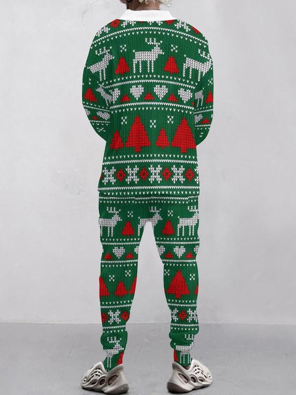 KZZ Two-piece Set Men's Solid Jacquard Drop Shoulder V Neck Top & Drawstring Waist Pants