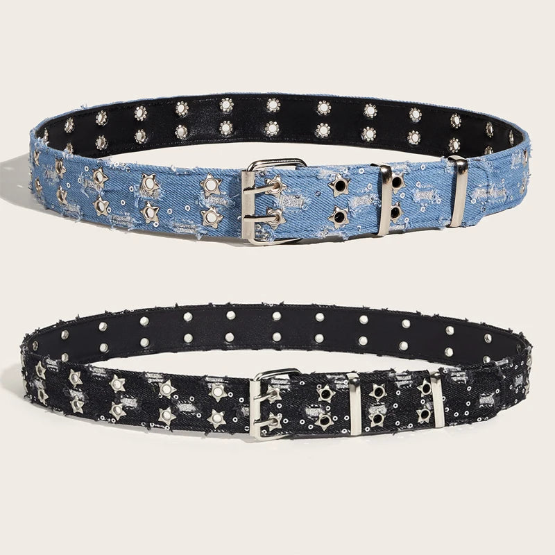 This wide-cut belt sculpts the waist with star-shaped hardware and scattered micro-studs for a high-contrast, punk-infused punch. Distressed and frayed for that undone edge, it’s finished with a dual-prong silver-tone buckle and a full lining built for all-day wear.